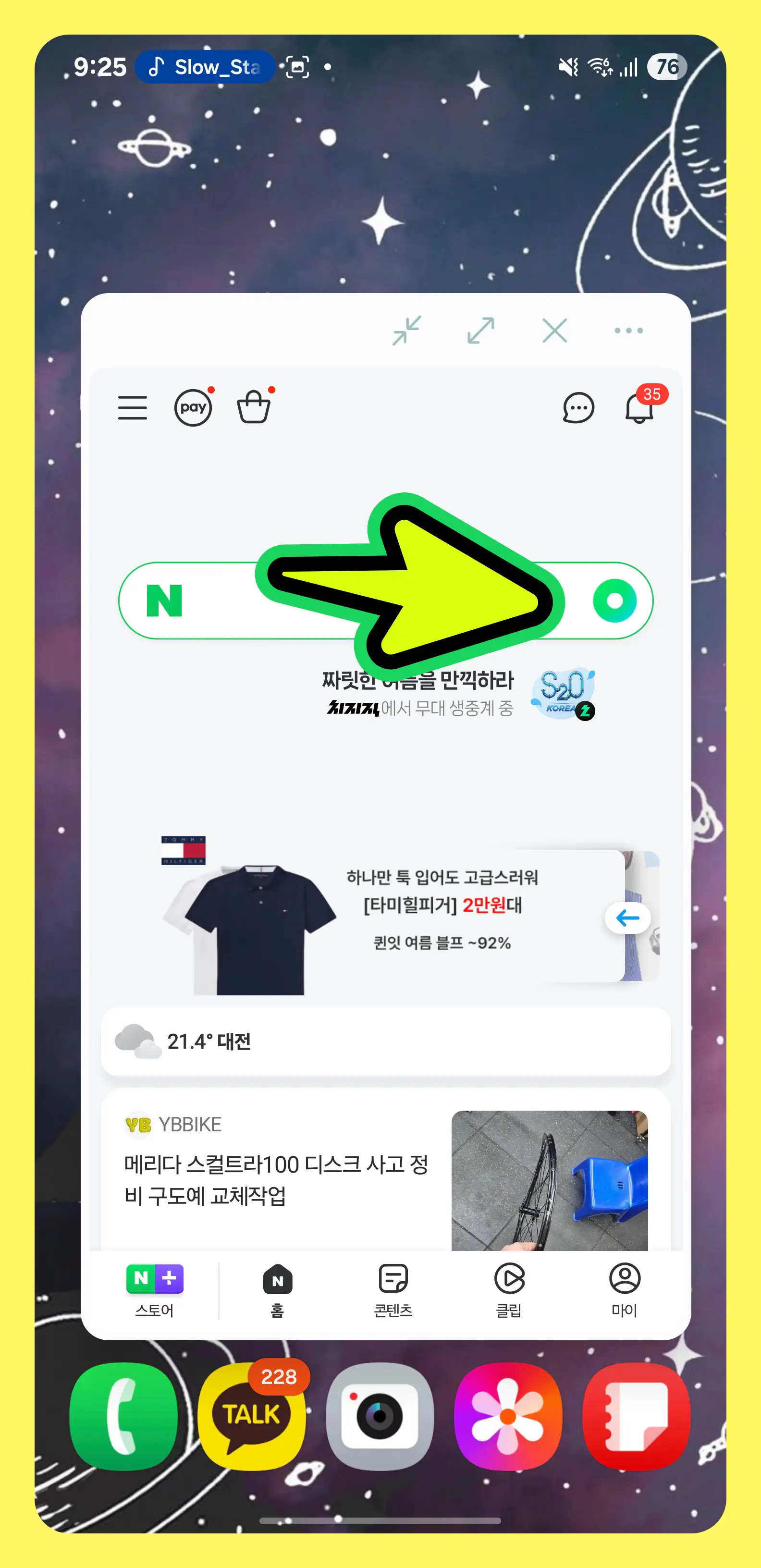 - 네이버 앱을 열고, 검색창 하단 또는 우측의 [녹색 원형 아이콘(그린닷)]을 눌러주세요.