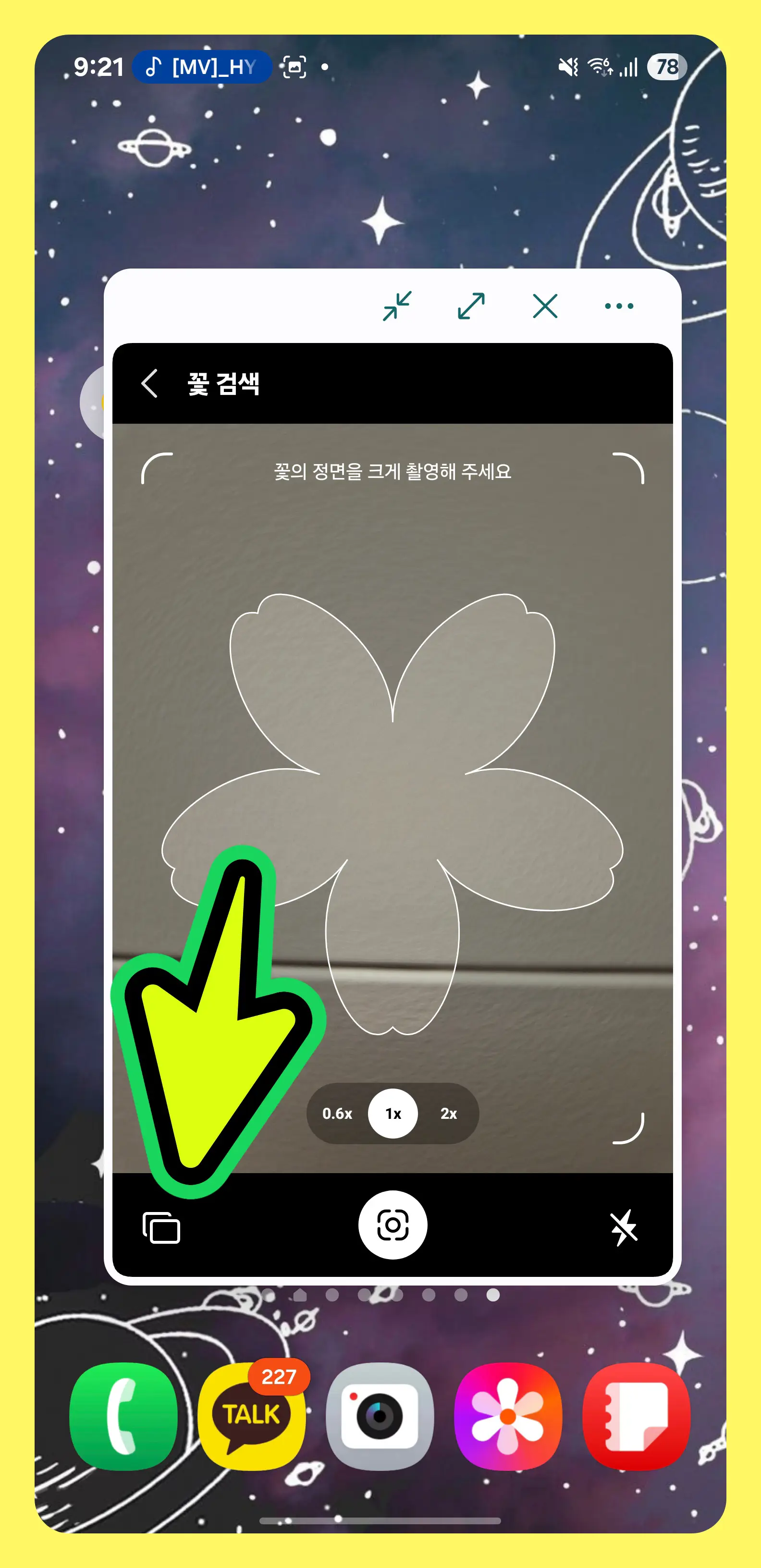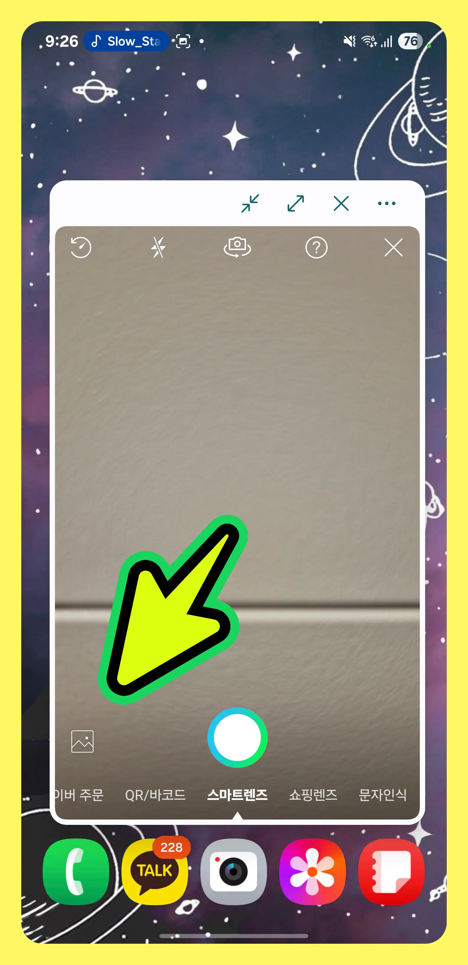 - (실시간 촬영 시) 카메라가 켜지면 하단 모드를 '스마트렌즈'로 맞추고 꽃을 촬영합니다.