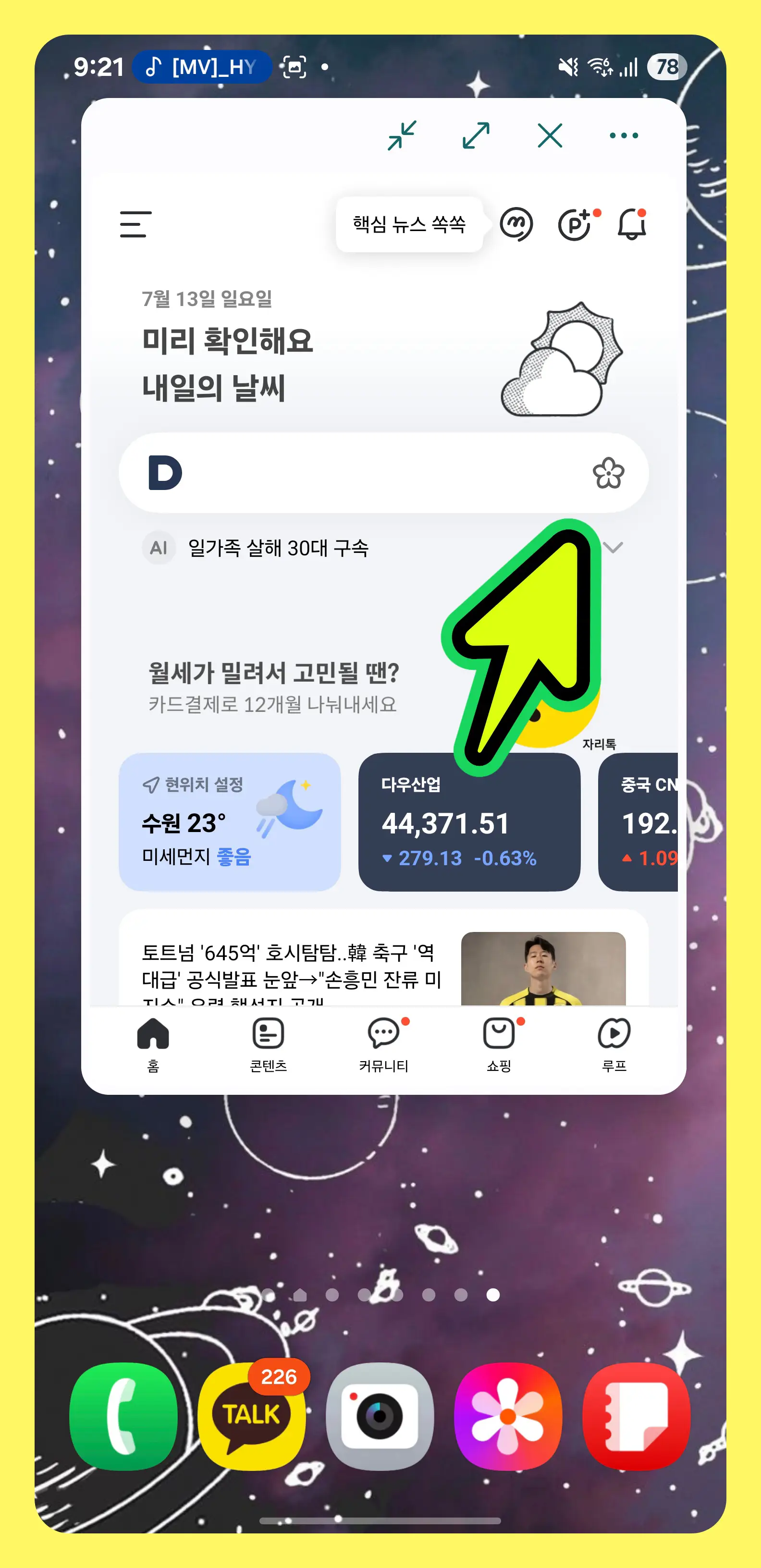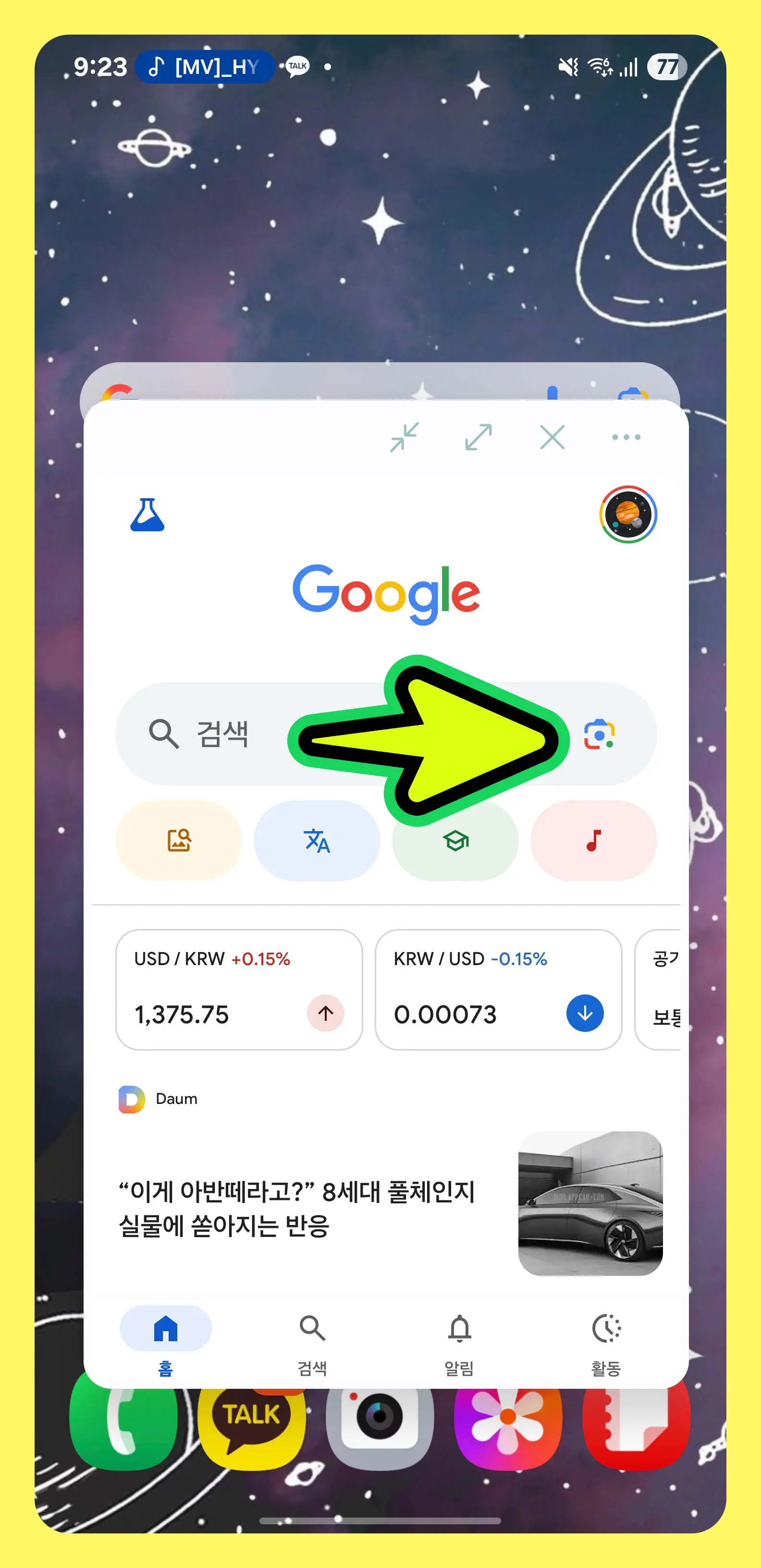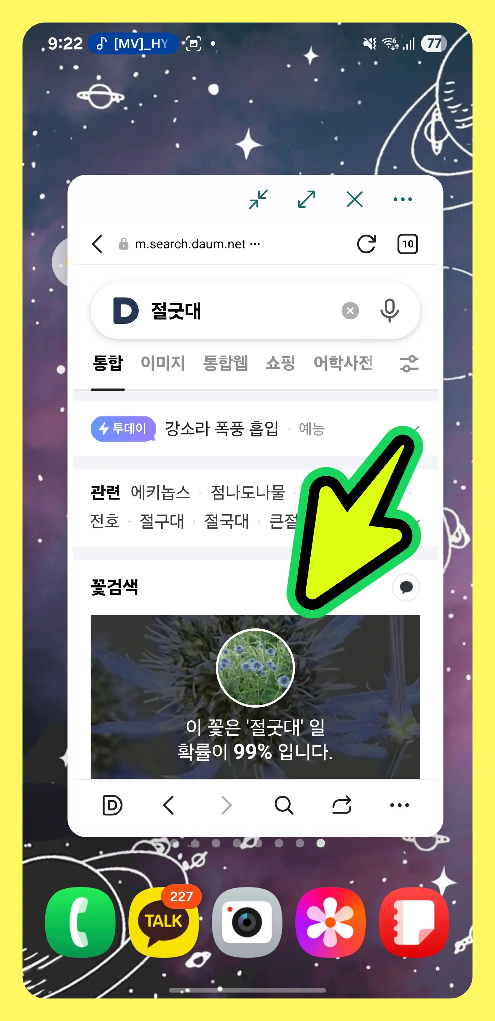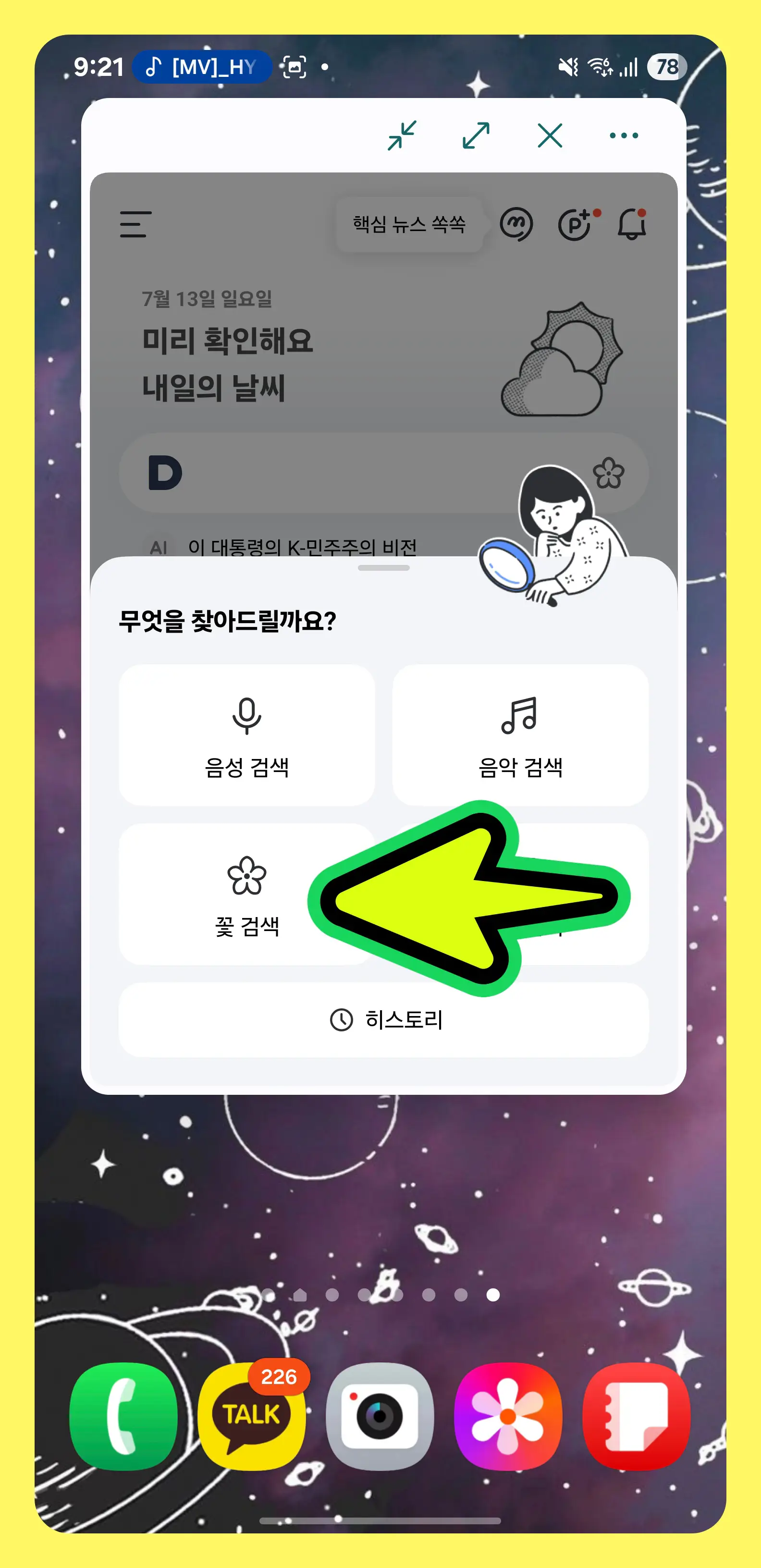 - 다음 앱을 열고, 검색창 오른쪽의 예쁜 [꽃 모양] 아이콘을 눌러주세요.